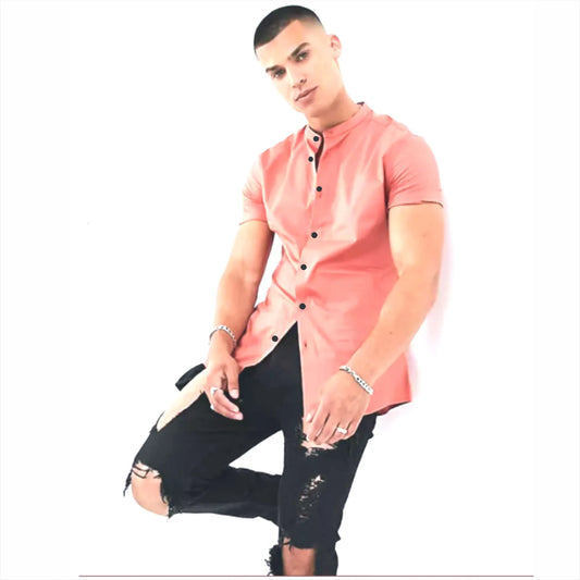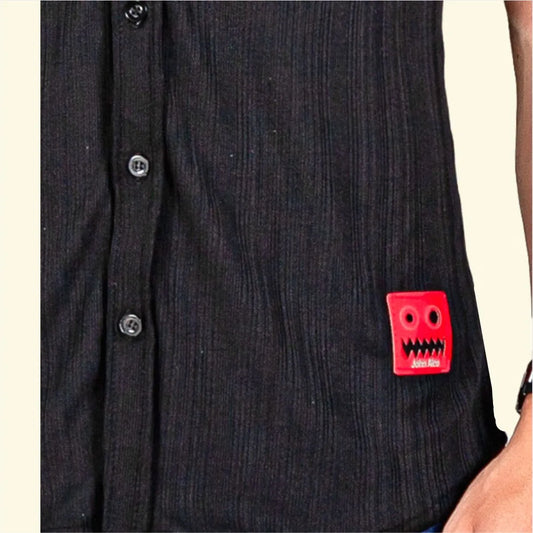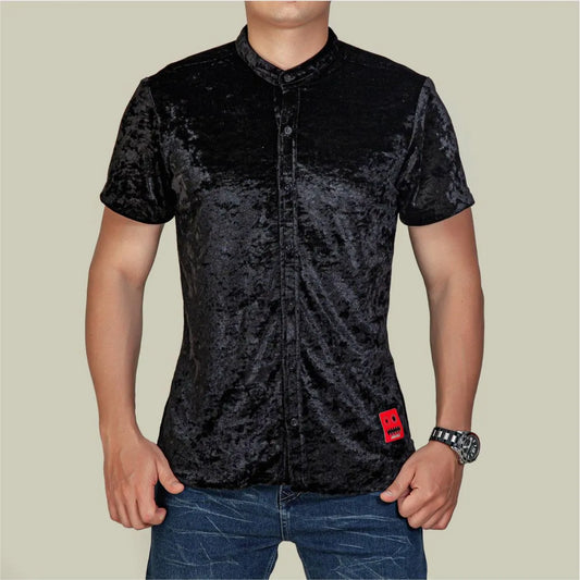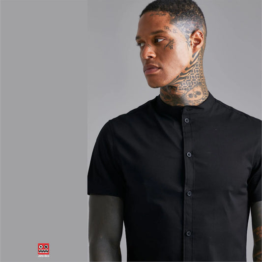 Camisa Manga Corta Negro Extrusión Cuello Mao