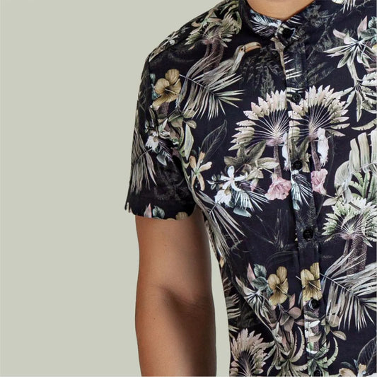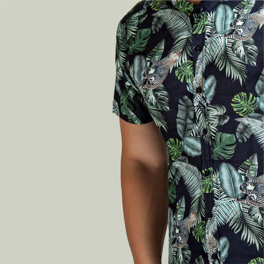 Camisa Manga Corta Negro Tigre Cuello Mao