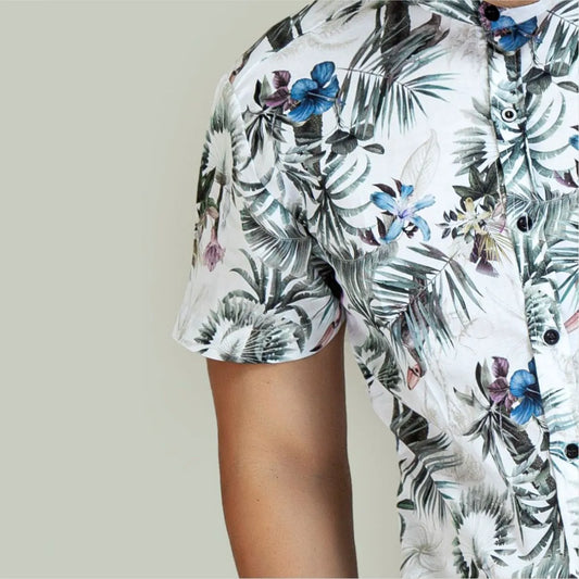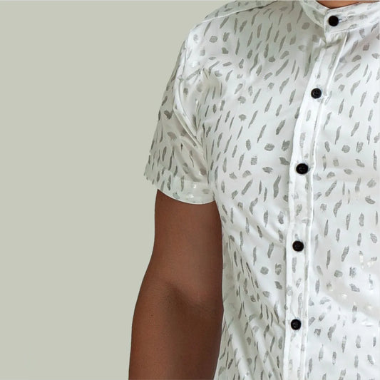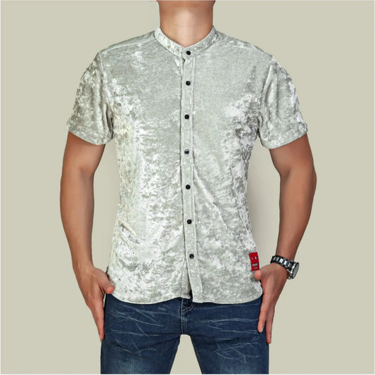 Camisa Manga Corta Resplandor Verde Plata Cuello Mao