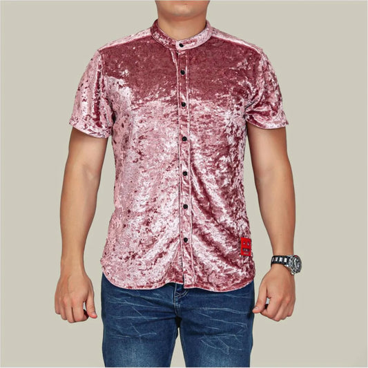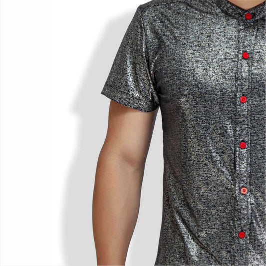 Camisa Manga Corta Resplandor Purpura Plata Cuello Mao